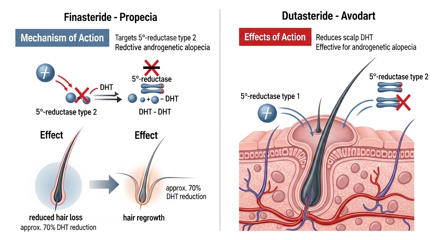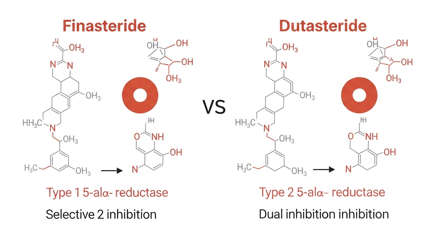 | 작용 기전 | 2형 5알파 환원효소 억제 (DHT 생성 억제) | 1형 및 2형 5알파 환원효소 억제 (DHT 생성 억제) |