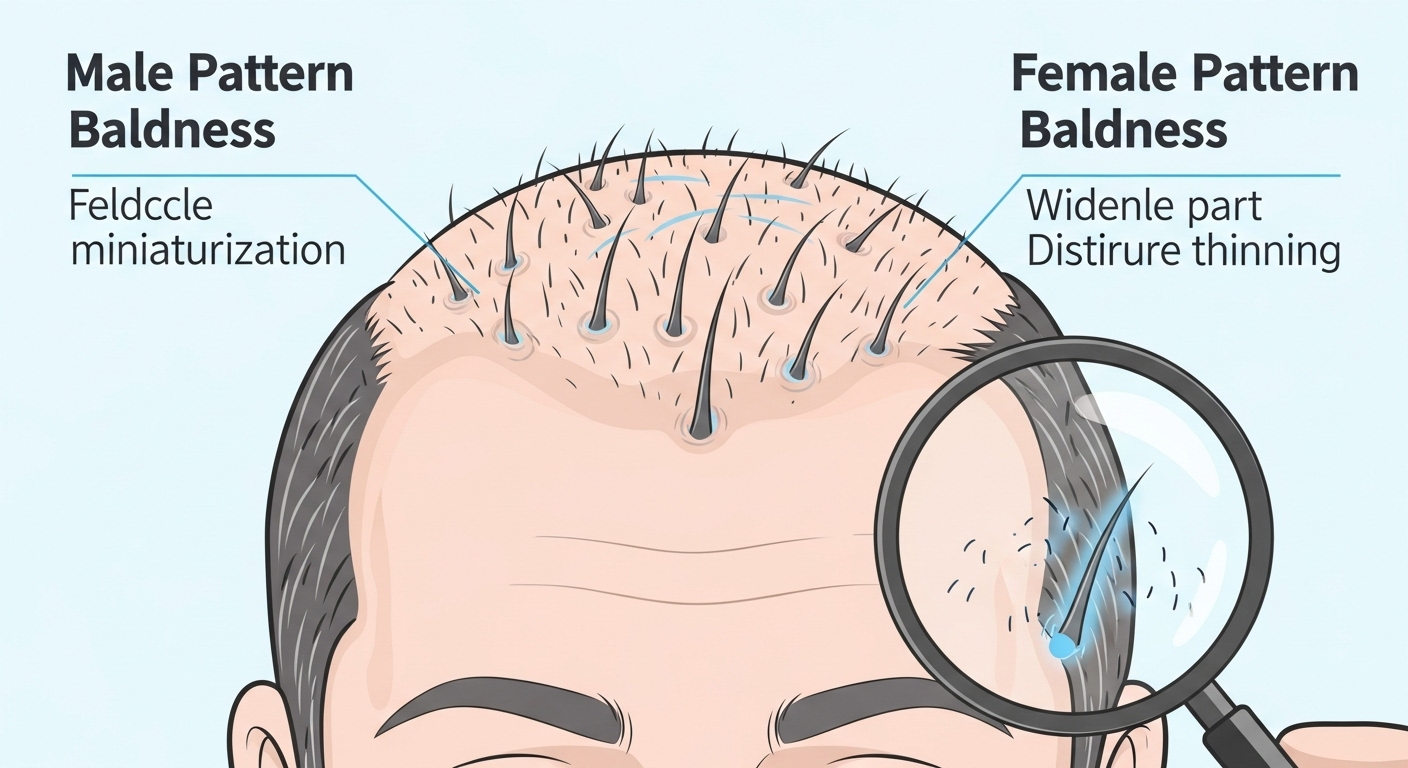 가장 흔한 탈모 유형이죠. 남성분들은 이마 양쪽 헤어라인이 점점 뒤로 밀려나 M자 형태가 되거나, 정수리 부위의 모발이 가늘어지며 두피가 비쳐 보이기 시작해요. 여성분들은 정수리 가르마가 점점 넓어지고 모발 전체의 밀도가 줄어드는 양상을 보이곤 합니다. 저도 처음에는 '머리 스타일 때문인가?' 하고 대수롭지 않게 여겼다가, 몇 년 후 확연한 차이를 보고 깜짝 놀랐습니다.