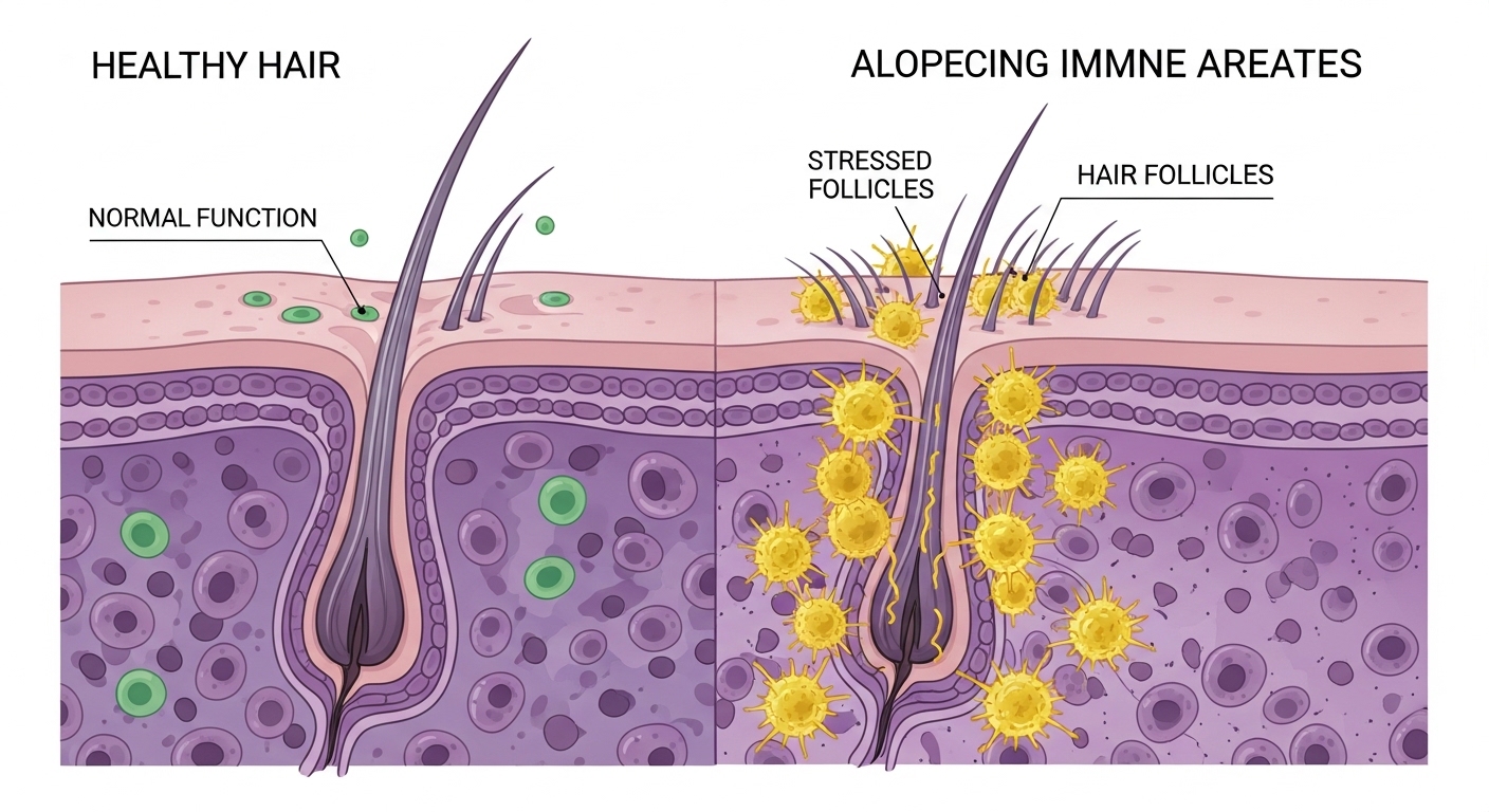 원형 탈모증은 우리 몸의 면역 체계가 모낭을 외부 침입자로 오인하여 공격함으로써 발생하는 자가면역 질환입니다. 이러한 면역 반응으로 인해 모발이 빠지고, 두피나 다른 체모 부위에 원형 또는 타원형의 탈모반이 나타나게 됩니다.