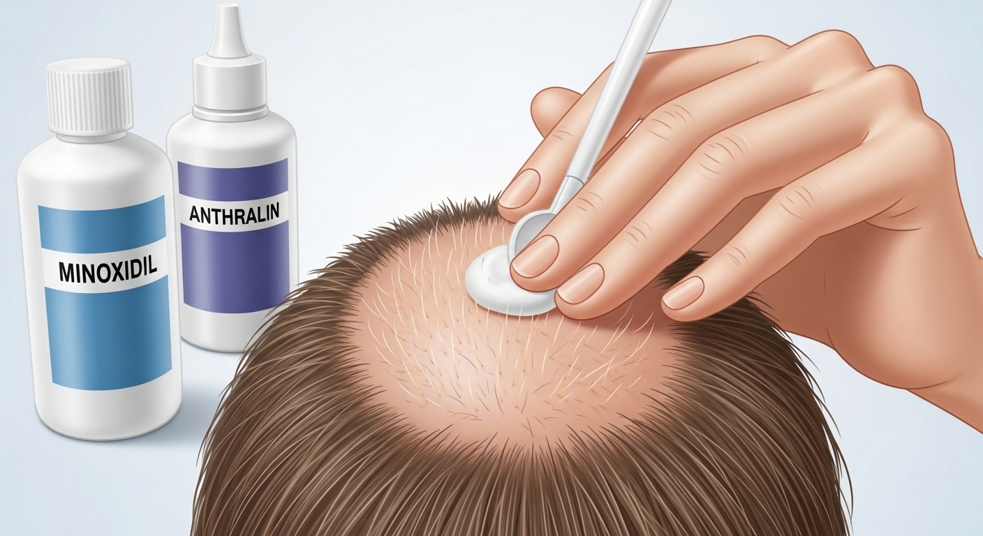 또 다른 면역억제 작용을 가진 약물인 안쓰랄린은 하루 한 번, 0.5%~1.0% 농도로 도포합니다. 자극 가능성 때문에 처음 2주 동안은 20~30분 후 씻어내고, 다음 2주 동안은 45분, 그 이후에는 최대 1시간까지 점차 시간을 늘려 사용하는 것이 중요해요. 눈썹이나 수염 부위, 눈에 들어가지 않도록 각별히 주의해야 하며, 피부 자극, 각질 형성, 모낭염, 림프절 비대, 피부 착색 등의 부작용이 있을 수 있습니다. 안쓰랄린 역시 미녹시딜과 병용했을 때 치료 효과가 더 좋다고 보고됩니다. [전문 자료 참고]