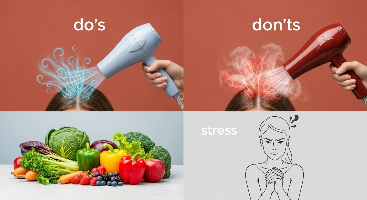 - 균형 잡힌 식단: 단백질, 비오틴, 아연, 철분, 비타민 등 모발 성장에 필요한 영양소를 충분히 섭취하세요.