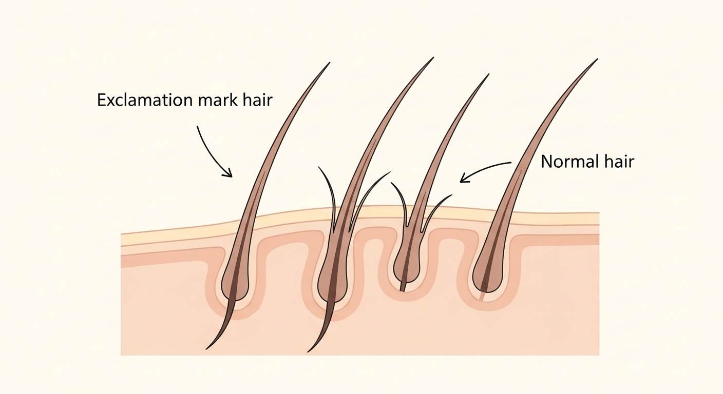 탈모반 주변의 모발 50~100가닥을 엄지와 검지로 잡고 가볍게 당겨봅니다. 만약 5가닥 이상이 쉽게 빠진다면 활동성 탈모일 가능성이 있습니다. - 3단계: 느낌표 모발 확인