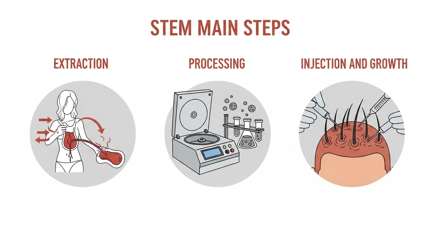 줄기세포 탈모 치료 과정은 주로 자가 지방 또는 혈액 채취, 줄기세포 분리 및 농축, 그리고 농축된 줄기세포를 탈모 부위에 직접 주사하는 세 가지 주요 단계로 진행됩니다. 각 단계는 전문 의료진의 지도하에 안전하게 이루어집니다.